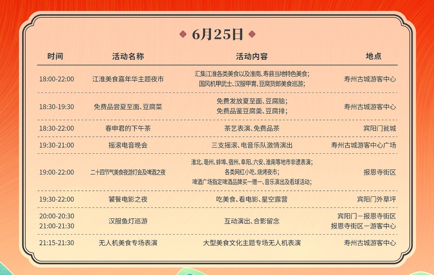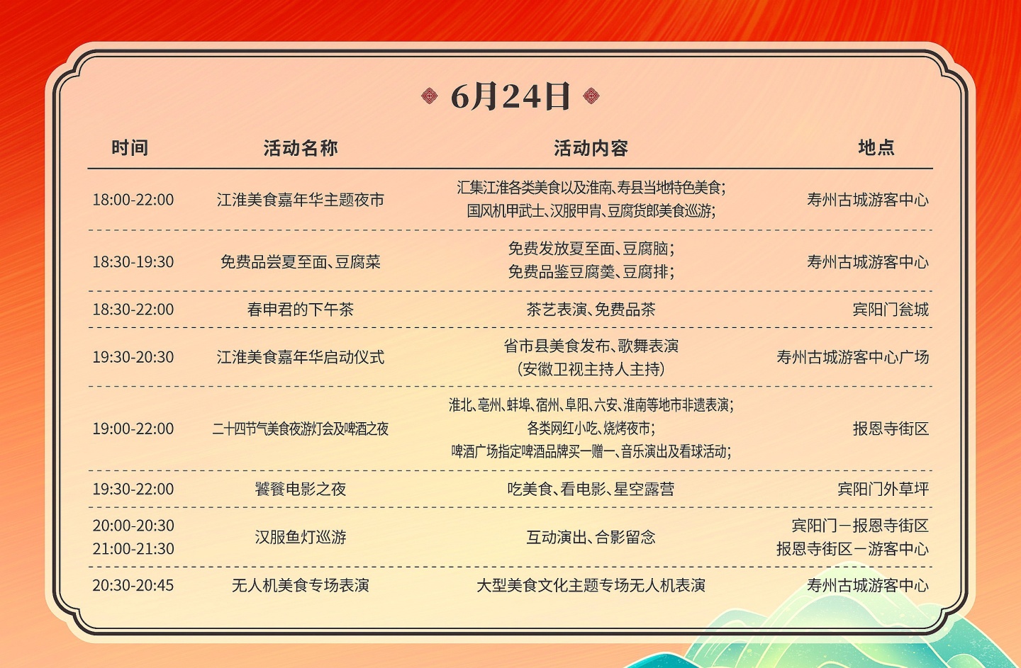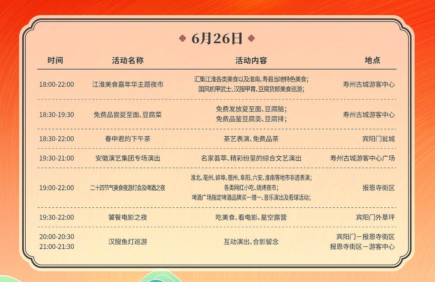 夏至!來壽縣品美食、游古城,釋放激情與活力!江淮美食嘉年華暨壽州古城尋味美食旅行月即將在6月24-26日期間隆重推出,讓廣大游客夢回千年楚都,既能體會來自二十四節氣發祥地壽州古城的楚風浪漫,也能品嘗地道壽州小吃及現代美食,在這里品茶、逛展、看電影、游燈會,邊吃邊逛邊拍照,帶來一場沉浸式的美食與文化盛宴。壽縣融媒體中心將對江淮美食嘉年華主會場開幕式進行全程現場直播,敬請關注!