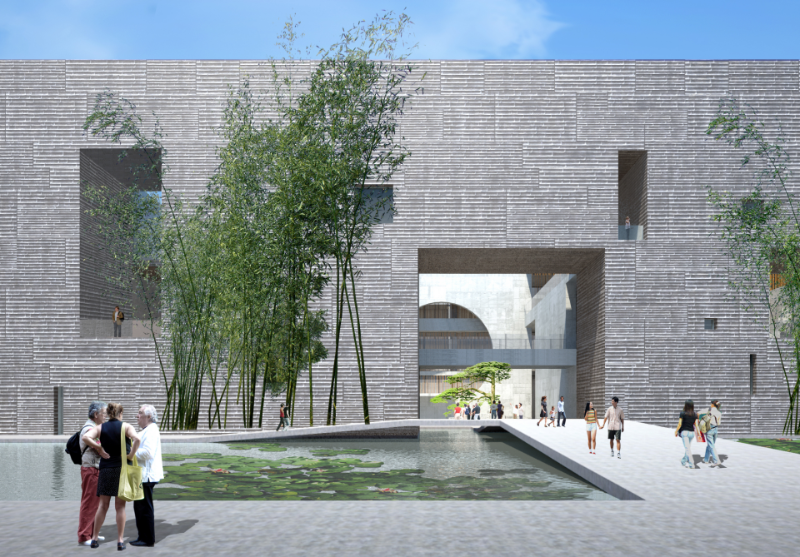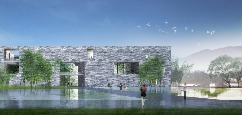 在概念設計中,結合了淮南為豆腐之鄉的民俗,主樓方正,同時,根據當地的風俗,采取了當地民居內斂的性格,以最簡單的正四方幾何形體作為建筑體量。在“豆腐塊”中,采用院落和天井的手段組織空間,最大限度的同時滿足自然通風和采光要求,解決了因單層平面過大而引起的通風采光不足問題。建筑設計中,采用特殊的施工工藝,外立面外墻采用竹紋清水混凝土墻面,內庭院外墻采用普通清水混凝土墻面,以混凝土原色來體現景觀效果。目前省內尚無此類建筑。