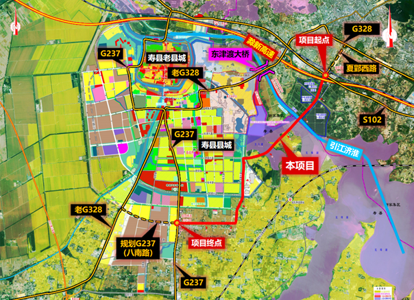 項目起于謝家集區唐山鎮夏郢西路,下穿S12滁新高速,跨瓦埠湖東淝河進入壽縣壽春鎮,接楚都大道后折向南,利用現狀濱湖大道至李家香店,經葛家圩子向西,終于壽縣壽濱村、與G237相交,路線全長約10.2公里,總投資約17.225億元,項目永久用地總規模約750畝。項目采用設計速度80千米每小時,路基斷面總寬33.0米的一級公路標準。