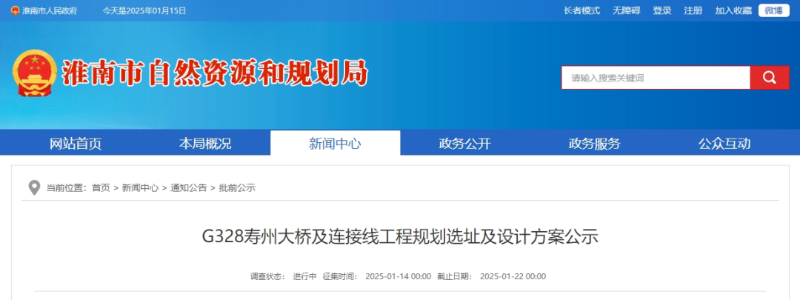 現將G328壽州大橋及連接線工程規劃選址及設計方案公示予以批前公示,征求市民意見。
