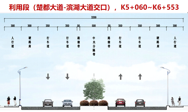 楚都大道至濱湖大道交口(利用段)路基標準橫斷面布置為:3米人行道+3米硬路肩+(2×3.5米)機動車道+0.5米路緣帶+5米中央分隔帶+0.5米路緣帶+(2×3.5米)機動車道+3米硬路肩+3米人行道=32米。
