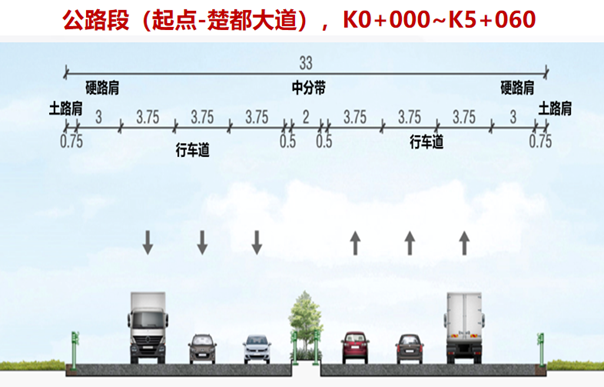 項目起點至楚都大道段路基標準橫斷面布置為:0.75米土路肩+3米硬路肩+(3×3.75米)機動車道+0.5米路緣帶+2米中央分隔帶+0.5米路緣帶+(3×3.75米)機動車道+3米硬路肩+0.75米土路肩=33米。