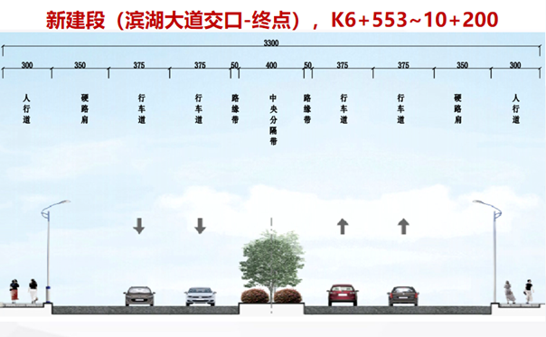 濱湖大道交口至項目終點段路基標準橫斷面布置為:3米人行道+3.5米硬路肩+(2×3.75米)機動車道+0.5米路緣帶+4米中央分隔帶+0.5米路緣帶+(2×3.75米)機動車道+3.5米硬路肩+3米人行道=33米。