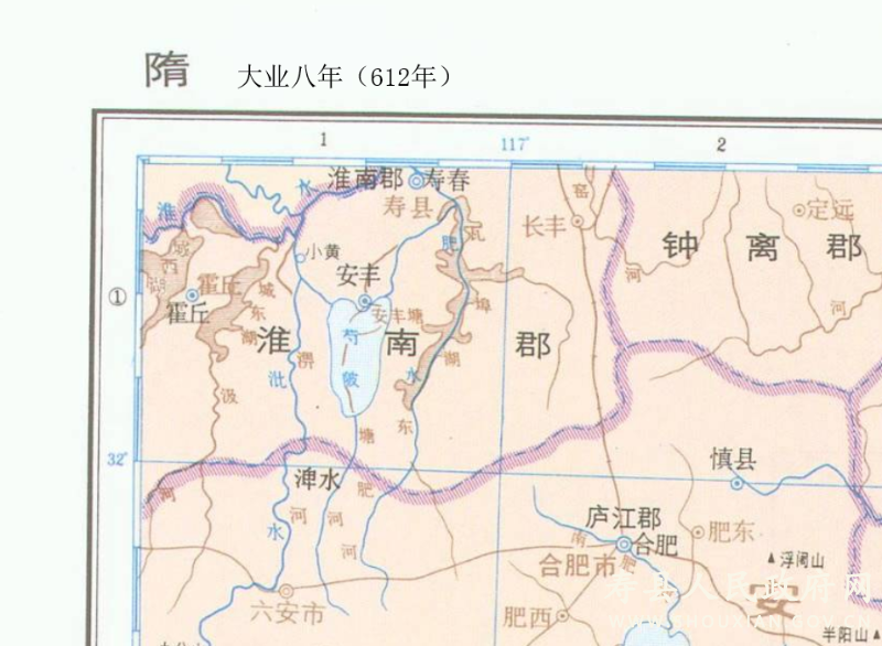 隋開皇八年(公元588年)置淮南行臺尚書省,治所壽春;次年滅陳,改行臺省為壽州總管府。大業(yè)三年(公元607年)改置淮南郡,壽春為郡治所。