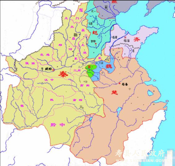 秦王政二十四年(公元前223年)秦破楚克郢,虜楚王負芻,楚亡;越二年秦劃江淮及其以南地區(qū)為九江郡,置壽春縣,為郡治。