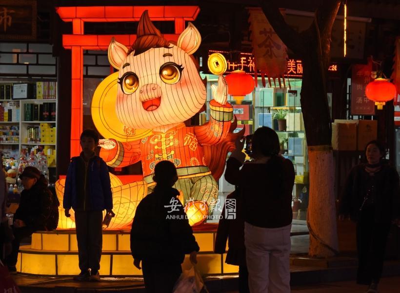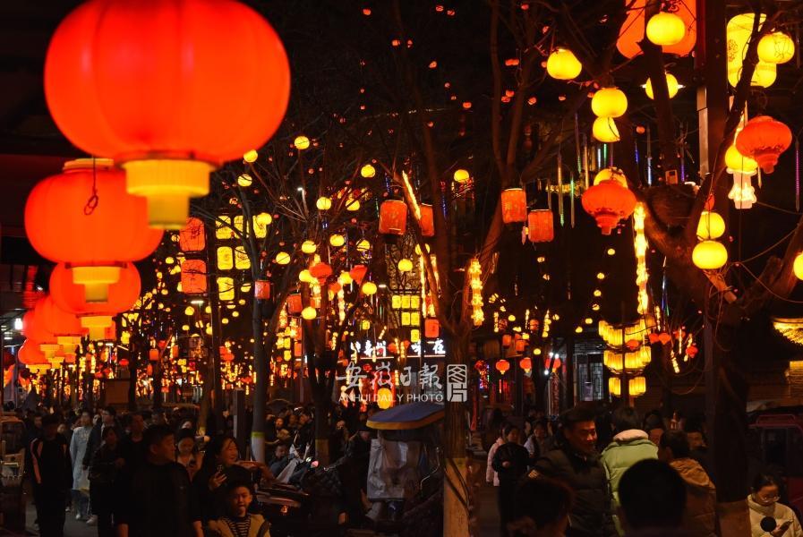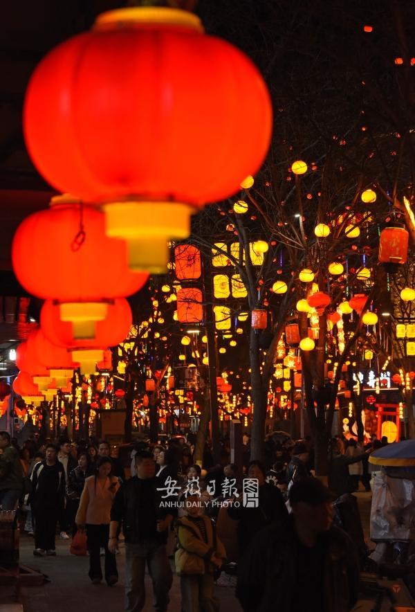 2月20日,游客在安徽省淮南市壽縣古城賞燈。春節(jié)期間,淮南市壽縣古城夜色在各類彩燈裝飾下流光溢彩,營造出喜慶祥和的新春佳節(jié)氛圍,吸引各地游客逛古城、品美食、賞美景。