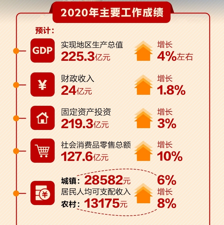 初步核算,2020全年地區(qū)生產(chǎn)總值[2](GDP)223億元,按可比價格計算,比上年增長2.1%。分產(chǎn)業(yè)看,第一產(chǎn)業(yè)增加值55.5億元,增長1.0%;第二產(chǎn)業(yè)增加值56.4億元,下降0.4%;第三產(chǎn)業(yè)增加值110億元,增長4.5%。三次產(chǎn)業(yè)結(jié)構(gòu)由上年的23.8︰26.6︰49.6變化為24.9:25.3:49.8,其中工業(yè)增加值占GDP的比重為18.8%。全縣年末常住人口83.85萬人,全年常住居民人均地區(qū)生產(chǎn)總值達(dá)23576元(折合3418美元),比上年增加3629元。