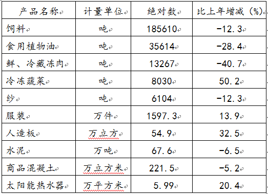在主要工業(yè)產(chǎn)品產(chǎn)量中,冷凍蔬菜、服裝加工、人造板和太陽(yáng)能熱水器分別比去年增長(zhǎng)50.2%、13.9%、32.5%和20.4%。