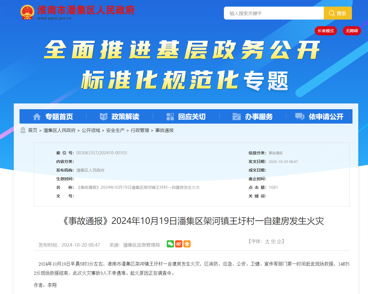 潘集區架河鎮王圩村 “10?19” 自建房火災事故