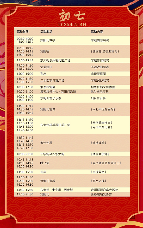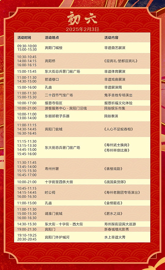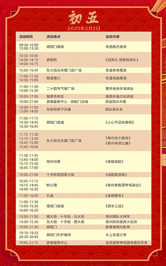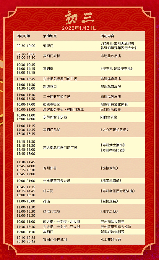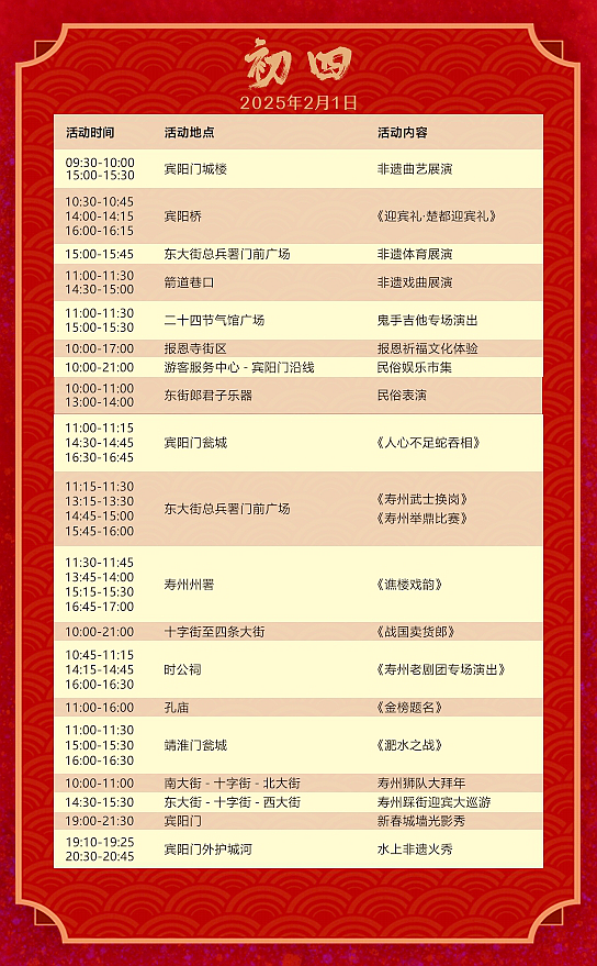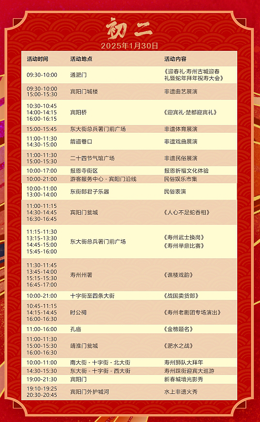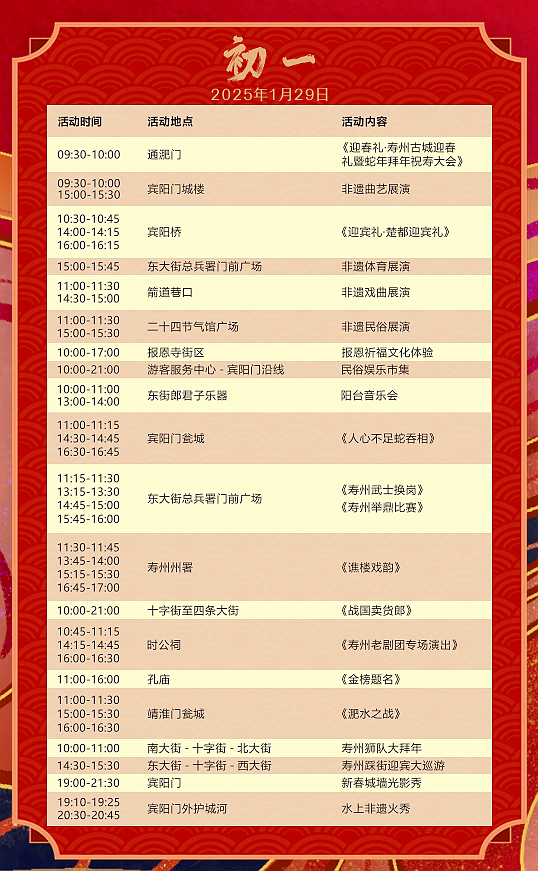 2025年春節期間,壽縣精心策劃了一系列文化惠民節慶活動。除夕到初七好戲連臺,節目單讓我們一起先睹為快!