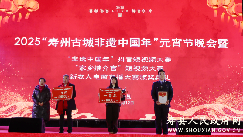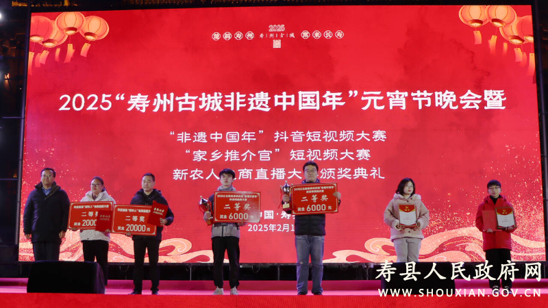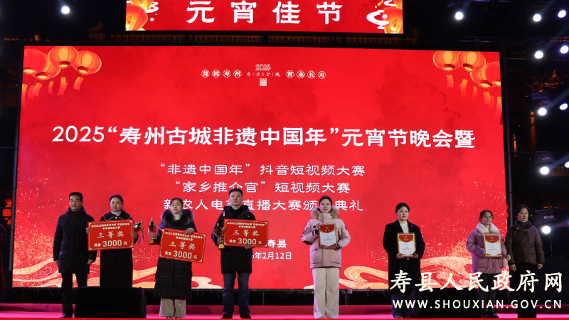 2月12日,“壽州古城非遺中國年”元宵節晚會暨“非遺中國年”抖音短視頻大賽、“家鄉推介官”短視頻大賽、新農人電商直播大賽頒獎儀式在壽州古城游客中心舉辦??h政協主席李瓊,縣領導王亞暉、洪毅然、饒潔、李銳、吳標等出席活動并為大賽獲獎人員頒獎。
