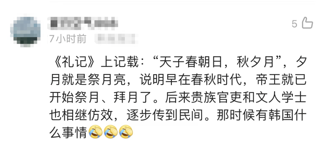 本人雖然以為中秋節受到了新羅的影響,但始終認為中秋節是中國的傳統節日,絕非源自韓國。之所以產生歧義,給讀者造成誤解,是因為本人在參考北宋人龐元英所著《文昌雜錄》、載于《文史哲》2003年11月期的論文《中秋節源自新羅考》、載于《文史知識》(1996年)的閱讀理解題,以及日本來唐僧人圓仁所著的《入唐求法巡禮行記》這些資料時,沒能全面介紹、辨析各種觀點,表述過于武斷、片面。在用詞上也不嚴謹,特別是“洋節”一詞,只追求熱點詞匯,卻造成了歧義。