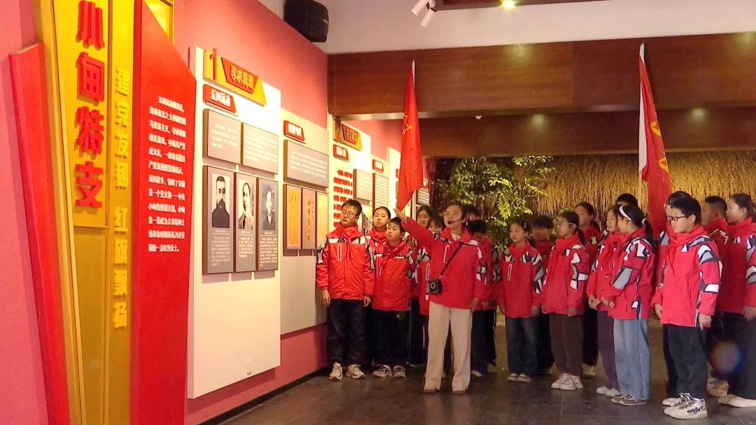 壽縣中小學校充分利用紅色資源,組織青少年學生前往位于小甸鎮安徽第一面黨旗紀念園祭掃烈士陵園,參觀小甸集特支紀念館、壽縣革命烈士事跡陳列室、淮上中學補習社,引領其從小銘記歷史、致敬英雄,接受愛國主義教育。“我熱愛中國共產黨,熱愛祖國,熱愛人民,好好學習,好好鍛煉,準備著:為共產主義事業貢獻力量。”小甸鎮的安徽第一面黨旗紀念園內莊嚴肅穆,小甸小學六(2)班少先隊員參加“紅領巾向英烈致敬”主題隊日活動,重溫入隊誓詞,使其在沉浸式體驗中增進對“先鋒”含義的深刻理解。“生活在小甸鎮這塊紅色沃土上,我感到非常自豪。作為新時代的少年,我要樹立遠大理想,勤奮學習,為未來祖國的發展貢獻一份自己的力量。”壽縣小甸小學學生周子涵說出自己心聲。