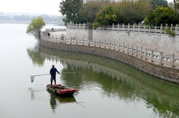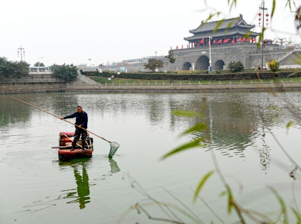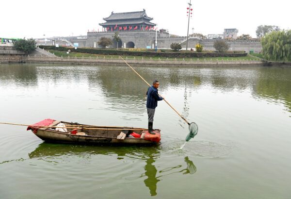 近日,國家歷史文化名城淮南市壽縣古城護城河上,水面環衛保潔員吳海山劃著小船清理水面漂浮物,保障護城河水清景美,迎接全國各地游客暢游古城。近年來,淮南市壽縣加大古城水體保護,整治清淤護城河近10公里,延伸建設城市防洪排水景觀渠8.5公里,使古城護城河水由原來的死水變成活水,通過水生態修復,形成“以水為友”的生態海綿古城。