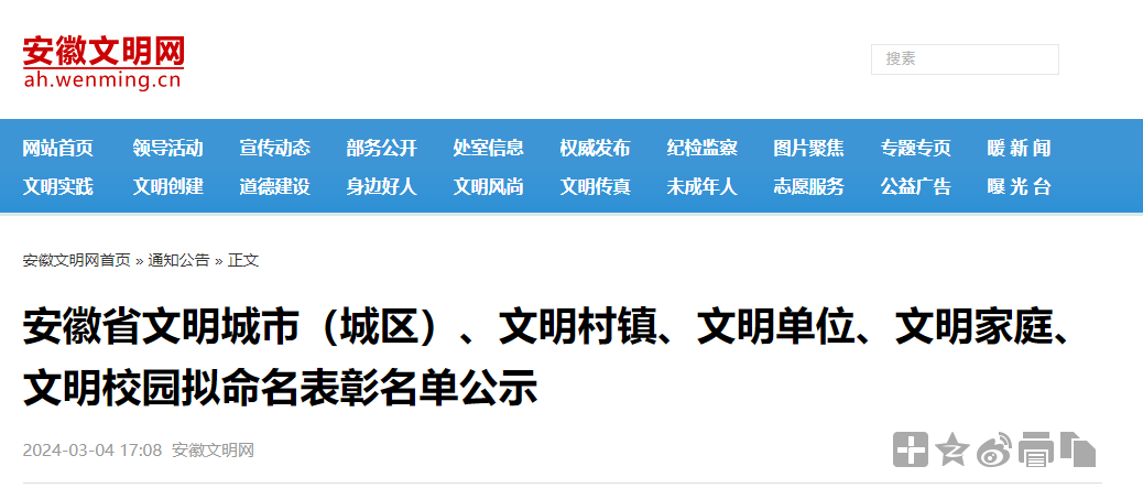 根據(jù)《關(guān)于開展安徽省文明城市(城區(qū))、文明村鎮(zhèn)、文明單位評(píng)選和安徽省文明家庭、文明校園推選工作的通知》(皖文明[2022]4號(hào))要求,在層層申報(bào)、認(rèn)真考核并廣泛征求部門意見的基礎(chǔ)上,形成了擬命名表彰的安徽省文明城市(城區(qū))、文明村鎮(zhèn)、文明單位、文明家庭、文明校園名單(排名不分先后)。按程序報(bào)經(jīng)省委負(fù)責(zé)同志同意,現(xiàn)予公示,接受社會(huì)各界監(jiān)督。如有異議,請(qǐng)?jiān)诠酒趦?nèi)以郵件、電話等方式向省精神文明建設(shè)辦公室反映。