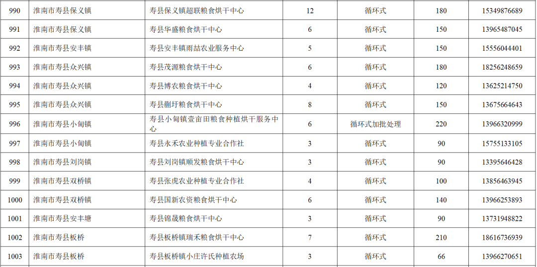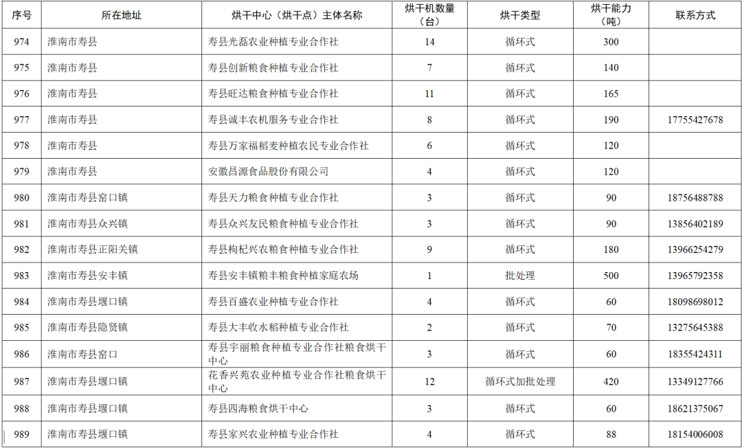 安徽省烘干中心(烘干點)信息表(壽縣部分)