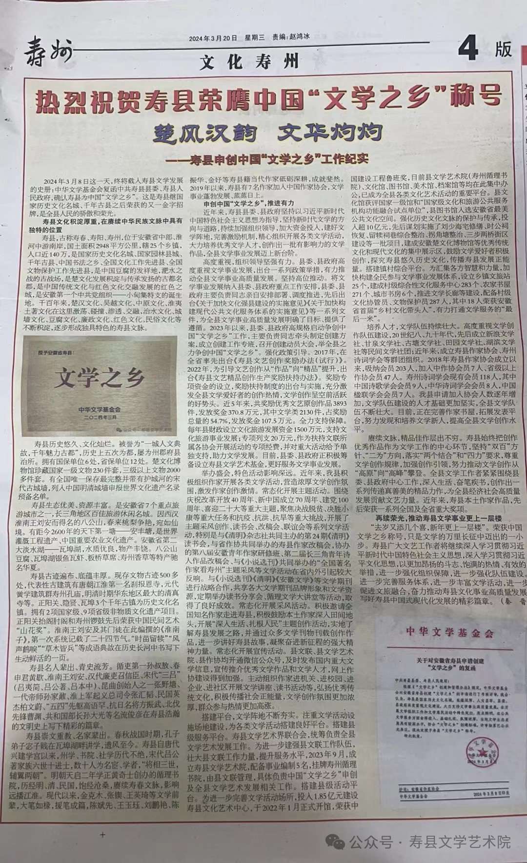 2024年3月8日,這一天,終將載入壽縣文學發(fā)展的史冊:中華文學基金會復(fù)函中共壽縣縣委、壽縣人民政府,確認壽縣為中國“文學之鄉(xiāng)”。這是壽縣繼國家歷史文化名城、千年古縣之后榮獲的又一金字招牌,是全縣人民的驕傲和榮光。壽縣文化積淀厚重,在賡續(xù)中華民族文脈中具有獨特的位置壽縣,古稱壽春、壽陽、壽州,位于安徽省中部、淮河中游南岸,國土面積2948平方公里,轄25個鄉(xiāng)鎮(zhèn),人口近140萬,是國家歷史文化名城、國家園林縣城、千年古縣、中國書法之鄉(xiāng)、全國文化工作先進縣、全國文物保護工作先進縣,是中國豆腐的發(fā)祥地,淝水之戰(zhàn)的古戰(zhàn)場,是楚文化發(fā)展積淀與傳承發(fā)揚的古都名郡,是中國傳統(tǒng)文化與紅色文化交融發(fā)展的紅色之城,是安徽第一個中共黨組織——小甸集特支的誕生地。千百年來,楚漢文化、吳越文化、中原文化、淮夷土著文化在這里激蕩、碰撞、滲透、交融,治水文化、城墻文化、豆腐文化、廉政文化、紅色文化、民俗文化等不斷積淀,逐步形成獨具特色的壽縣文脈。壽縣歷史悠久、文化燦爛。被譽為“一城人文典故,千年魅力古都”,歷史上五次為都,屢為州郡府縣治所。擁有國保單位6處,省保單位12處。楚文化博物館珍藏國家一級文物230件套,三級以上文物2000多件套。有全國唯一保存最完整并帶有護城河的宋代古城墻,列入中國明清城墻申報世界文化遺產(chǎn)名錄預(yù)備名單。壽縣生態(tài)優(yōu)美、資源豐富。是安徽省7個重點旅游城市之一,長三角地區(qū)百佳旅游休閑名城。因西漢淮南王劉安而得名的八公山,春來桃梨爭艷,宛如仙境。有距今2600年的天下第一塘——安豐塘,是世界灌溉工程遺產(chǎn)、中國重要農(nóng)業(yè)文化遺產(chǎn)。安徽省第二大淡水湖——瓦埠湖,水質(zhì)優(yōu)良,物產(chǎn)豐饒。八公山豆腐、瓦埠湖銀魚瓦蝦、板橋草席、壽州香草等特產(chǎn)馳名華夏。壽縣古跡遍布、底蘊豐厚。現(xiàn)存文物古跡500多處,代表性古建筑有唐朝江淮第一名剎報恩寺,元代黌學建筑群壽州孔廟,明清時期華東地區(qū)最大的清真寺等。正陽關(guān)、隱賢、瓦埠3個千年古鎮(zhèn)為歷史文化名鎮(zhèn)。擁有2項國家級、9項省級非物質(zhì)文化遺產(chǎn)項目。正陽關(guān)抬閣肘閣和壽州鑼鼓先后榮獲中國民間藝術(shù)“山花獎”。淮南王劉安及其門徒在此編撰的《淮南子》,第一次系統(tǒng)記載了二十四節(jié)氣。“時苗留犢”“風聲鶴唳”“草木皆兵”等成語典故在歷史長河中書寫下生動鮮活的一頁。 壽縣名人輩出、青史流芳。循吏第一孫叔敖、春申君黃歇、淮南王劉安、漢代廉吏召信臣、宋代“三呂”(呂夷簡、呂公著、呂本中)、昆曲創(chuàng)始人之一張野塘、一代帝師孫家鼐、淮上軍起義總司令張匯韜、民國英杰柏文蔚、“五四”先軀高語罕、抗日名將方振武、北伐先鋒曹淵、共和國部長孫大光等名流俊彥在壽縣浩瀚的文明史上寫下精彩的篇章。壽縣崇文重教、名家輩出。春秋戰(zhàn)國時期,孔子弟子宓子賤在瓦埠湖畔講學,遺風至今。壽縣自唐代興建學宮以來,州學、書院、社學歷代不絕,宋代呂公著家族六世十進士,數(shù)十人為名宦、學者,“將相三世,輔翼兩朝”。明朝天啟二年學正黃奇士創(chuàng)辦的循理書院,歷經(jīng)明、清、民國,飽經(jīng)滄桑,賡續(xù)壽春文脈,影響遠播江淮。現(xiàn)代以來,金克木、張鍥、王英琦等文學前輩,大筆如椽,援筆成篇,陳斌先、王玉玨、劉鵬艷、陳振華、金妤等壽縣籍當代作家砥礪深耕,成就斐然。2019年以來,壽縣有7名作家加入中國作家協(xié)會,文學事業(yè)蓬勃發(fā)展、蒸蒸日上。申創(chuàng)中國“文學之鄉(xiāng)”,推進有力。近年來,壽縣縣委、縣政府堅持以習近平新時代中國特色社會主義思想為指導(dǎo),堅持新時代文學的方向與道路,持續(xù)加強組織領(lǐng)導(dǎo),加大資金投入,建好文學陣地,完善激勵機制,精心組織開展各類文學活動,大力培養(yǎng)優(yōu)秀文學人才,創(chuàng)作出一批有影響力的文學作品,全縣文學事業(yè)發(fā)展邁上新臺階。高度重視,組織領(lǐng)導(dǎo)堅強有力。縣委、縣政府高度重視文學事業(yè)發(fā)展,出臺一系列政策舉措,有力推動全縣文學事業(yè)高質(zhì)量發(fā)展。堅持高位推動。將文學事業(yè)發(fā)展納入縣委、縣政府重點工作安排,縣委、縣政府主要負責同志親自安排部署、調(diào)度推進,先后出臺《關(guān)于加快文化強縣建設(shè)的實施意見》《關(guān)于加快構(gòu)建現(xiàn)代公共文化服務(wù)體系的實施意見》等一系列文件,為全縣文學事業(yè)高質(zhì)量發(fā)展明確了目標、提供了遵循。2023年以來,縣委、縣政府高規(guī)格啟動爭創(chuàng)中國“文學之鄉(xiāng)”工作,主要負責同志牽頭制定創(chuàng)建方案,成立創(chuàng)建工作專班,召開創(chuàng)建動員大會,舉全縣之力爭創(chuàng)中國“文學之鄉(xiāng)”。強化政策引導(dǎo)。2017年,在全省率先出臺《壽縣文藝創(chuàng)作獎勵辦法(試行)》。2022年,為引導(dǎo)文藝創(chuàng)作從“作品”向“精品”提升,出臺《壽縣文藝精品創(chuàng)作生產(chǎn)獎勵扶持辦法》。獎勵專項資金的設(shè)立,獎勵扶持制度的出臺與實施,充分激發(fā)全縣文學愛好者的創(chuà