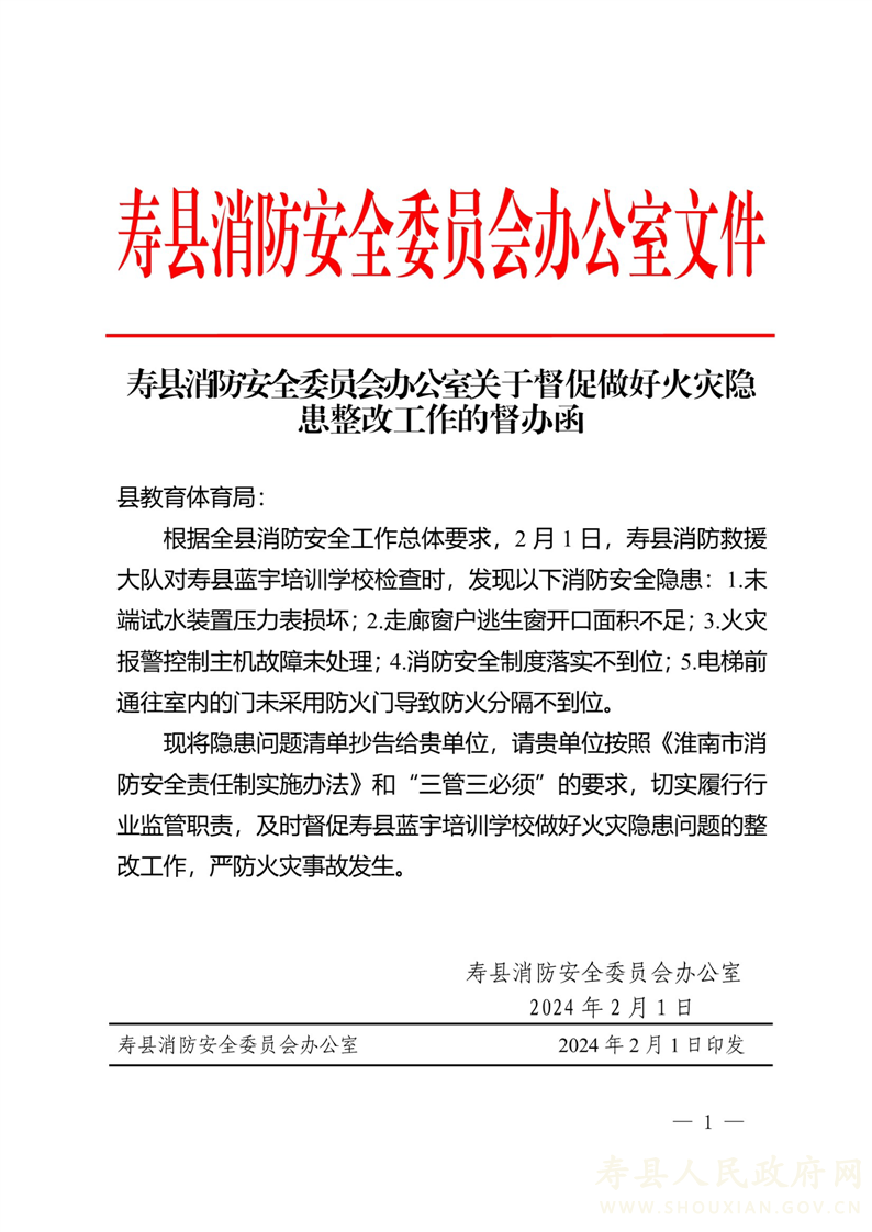 壽縣藍宇培訓(xùn)學(xué)校消防安全隱患問題督辦函
