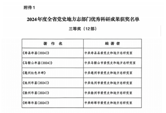 近日,全省黨史和地方志部門優(yōu)秀科研成果評選結果正式公布,壽縣檔案館(縣委黨史和地方志研究室)編纂的《壽縣年鑒》(2024年卷)榮獲全省“三等獎”。這是淮南市、縣(區(qū))2025年度唯一獲得省級表彰的地方綜合年鑒。也是《壽縣年鑒》自2017年創(chuàng)刊以來,第四次獲得此殊榮。
