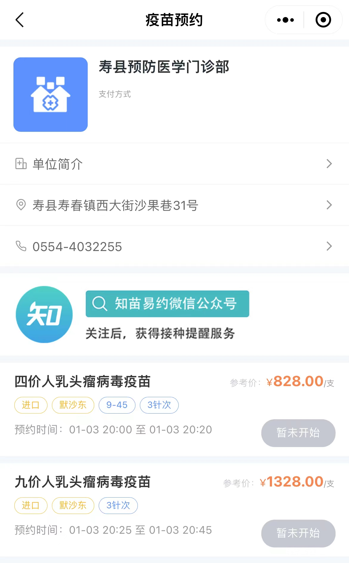 預(yù)約成功后請按照預(yù)約時間前往壽縣預(yù)防醫(yī)學(xué)門診部接種,超期未接種,視為自動放棄。(如無法按照預(yù)約日期當(dāng)天前往接種,可提前電話咨詢接種時間,咨詢電話:0554-4032255。)四價人乳頭瘤病毒(HPV)疫苗共3劑次,每劑次828元;九價人乳頭瘤病毒(HPV)疫苗共3劑次,每劑次1328元。預(yù)約成功后,按照預(yù)約成功時間前往接種點接種疫苗時現(xiàn)場繳費,具體繳費方式(線上線下、是否可刷醫(yī)保卡等)以接種門診規(guī)定為準。接種前不存在預(yù)交費,一切讓預(yù)交費的都是騙子!預(yù)交費的接種門診一律不予承認、不予接種!