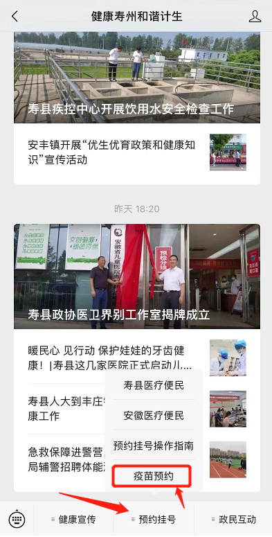 有意向接種者,可關(guān)注“健康壽州和諧計生”微信公眾號,按公告(設(shè)定)時間在線預(yù)約。預(yù)約參考步驟: