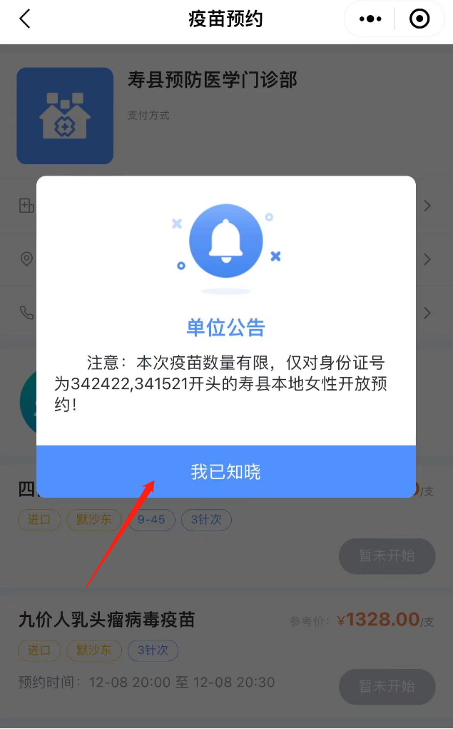 第三步:退回,點擊“壽縣預(yù)防醫(yī)學(xué)門診部”或上方搜索欄搜索“壽縣預(yù)防醫(yī)學(xué)門診部”后點擊進入,在開通網(wǎng)絡(luò)預(yù)約的時間點擊九價人乳頭瘤病毒疫苗右下角藍色圖標進入(未到預(yù)約時間顯示為灰色“暫未開始”)。