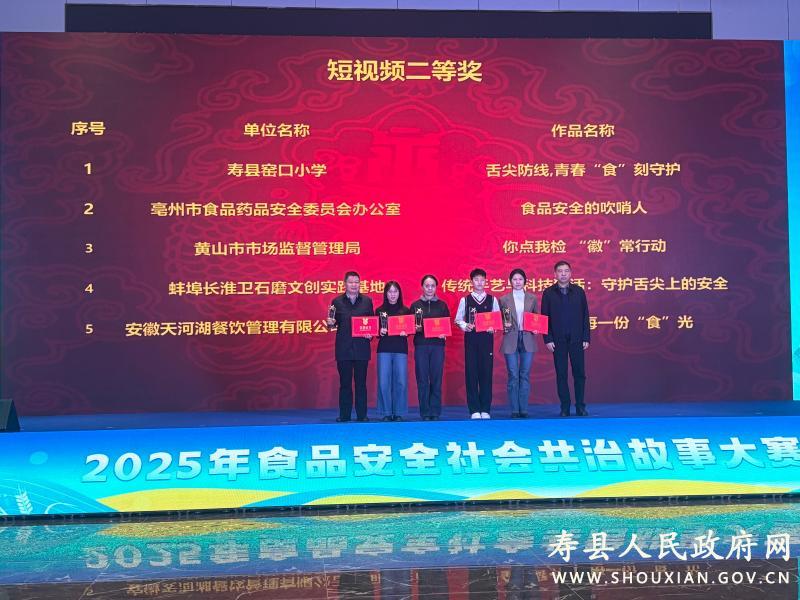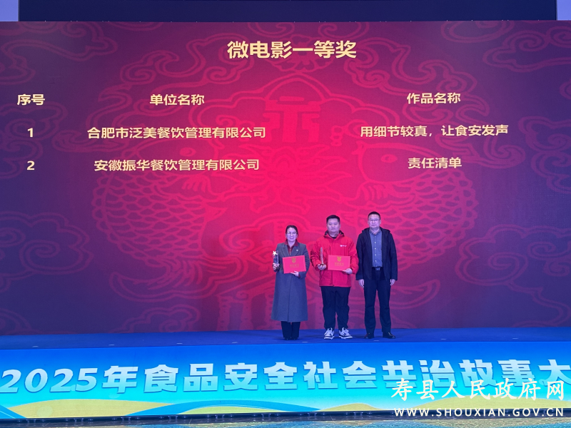 近日,在2025年安徽省食品安全社會共治故事大賽中,壽縣選送作品喜獲佳績。安徽振華餐飲管理有限公司參賽作品《責任清單》獲得微電影一等獎,壽縣窯口小學參賽作品《舌尖防線,青春“食”刻守護》獲得短視頻二等獎。